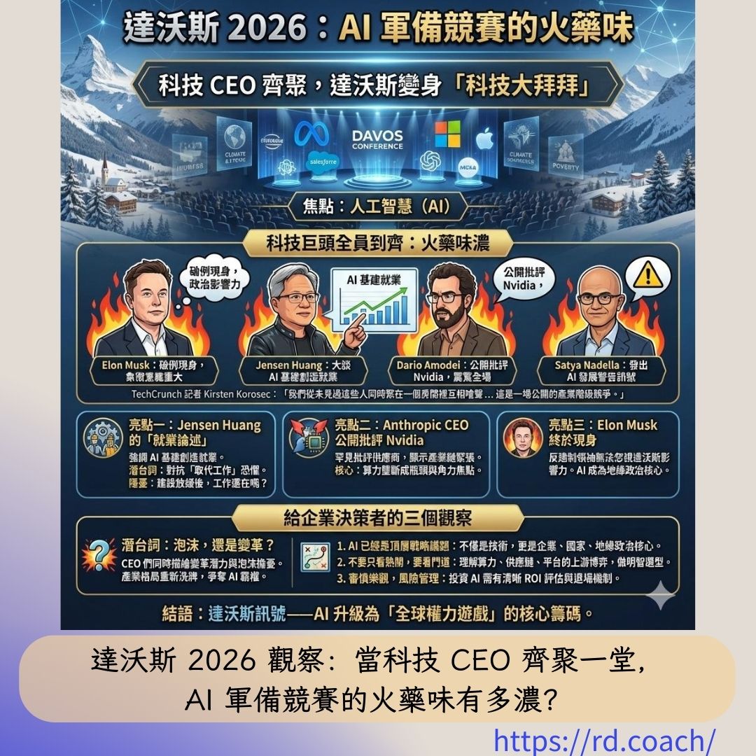 當全球最有影響力的經濟論壇被科技公司「接管」,這代表 AI 已經不只是技術議題,而是企業戰略、國家競爭力、甚至地緣政治的核心。