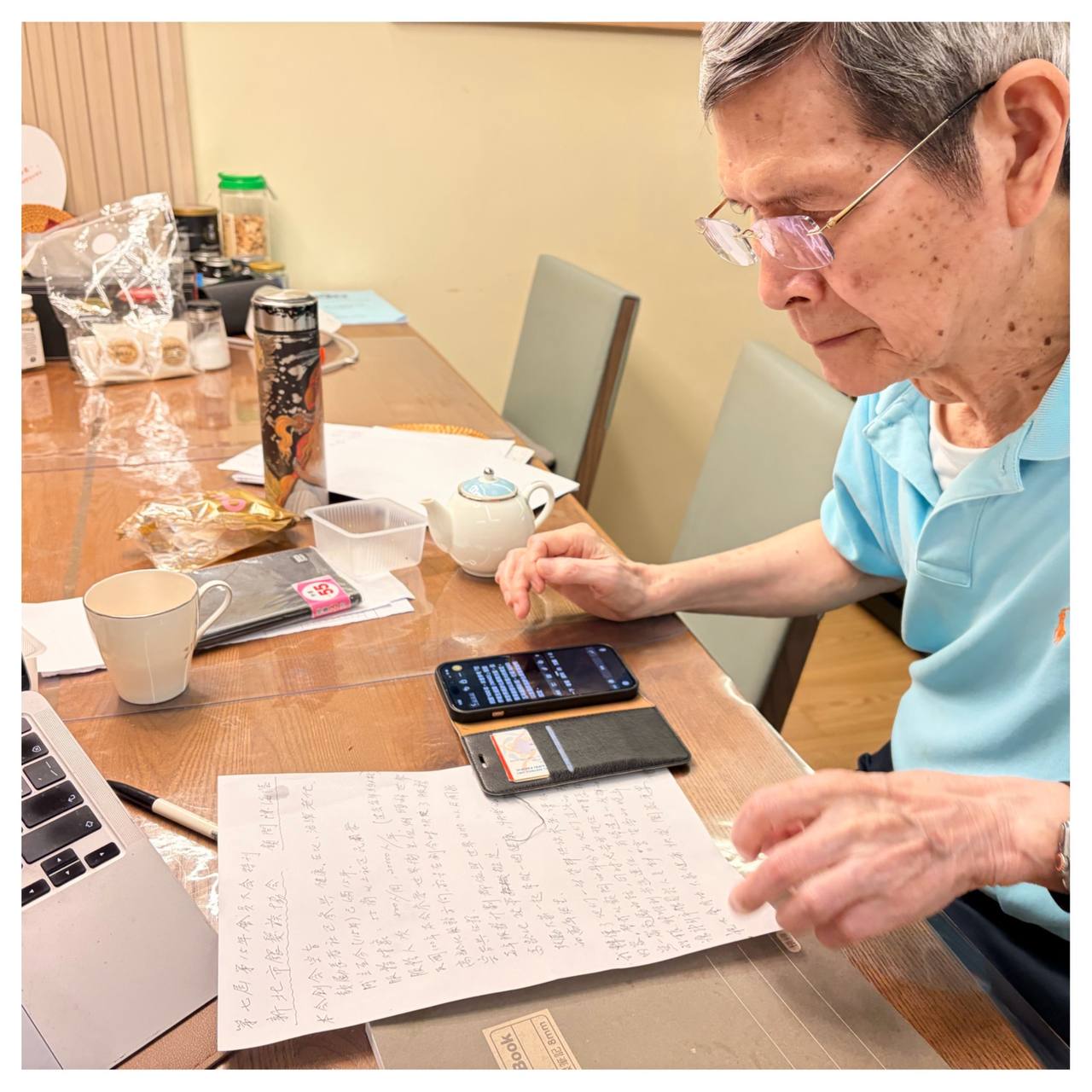 中午簡單在 7-11 吃了東西後,前往董事長家。今天他一個人在家,有明確任務:完成新北市銀髮協會 15 週年大會的祝賀詞。過程中,我教他用 Lens 拍攝手稿轉文字,再用 GPTs 的提示詞改進器優化,最後在 ChatGPT 裡整合理事長的致詞與他自己的草稿,快速生成不同字數的版本。董事長驚訝於「早上接到任務,晚上就能完成」的效率,覺得很新奇。