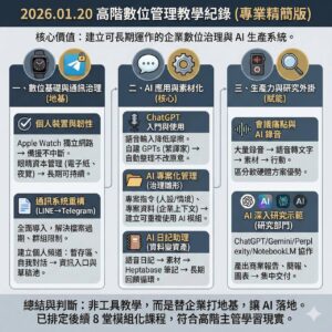今天的課程很順利。先展示了無線投影棒的效果,幫學生解決了大螢幕投影的問題;又協助他升級 iOS 舊版,並處理跨境購物 EZway 註冊的卡關。還特別提醒跨境購物要做「實名委任」與申報檢查。之後進入正課,講解 AI 四階段與 ChatGPT 的應用:搜尋、生成圖片、圖片辨識,以及付費版與免費版的差異。重點是要他每天花時間跟 ChatGPT 建立默契,這才是真正的訓練。