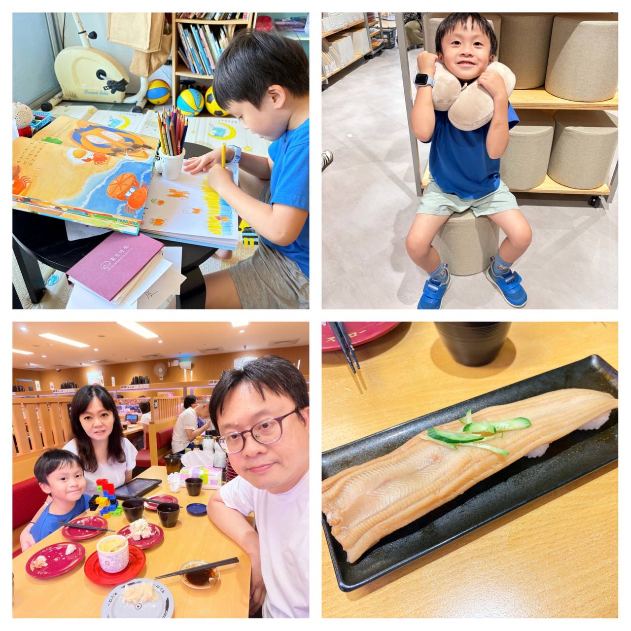 雖然人多但還算順利入座,我們嘗試了幾道新菜,像星饅這類期間限定品項。小悠悠最愛茶碗蒸和醋飯,老婆喜歡炙燒壽司,而我依舊最愛生魚片。吃飽後他扭蛋抽到一個不倒翁,開心得不得了。