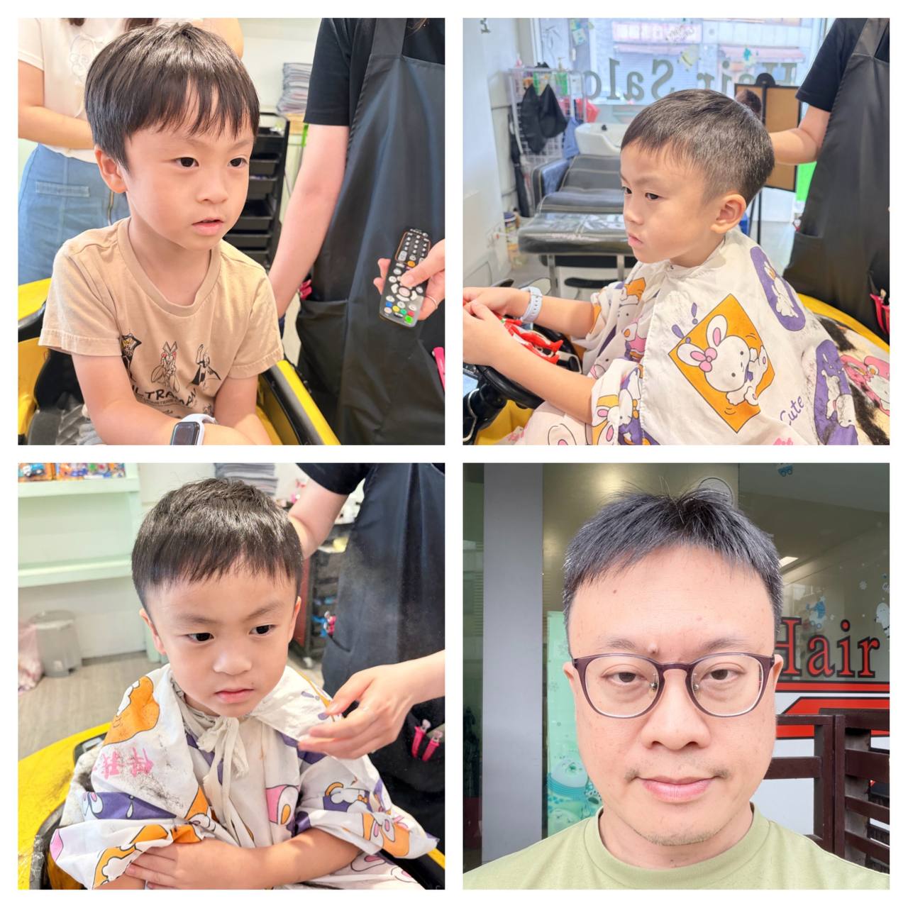 中午回到家,雨停了。和老婆一起吃午餐,聊上午課程的點滴。下午帶小悠悠去剪頭髮,本來兩點的預約鬧了雙胞,幸好最後協調順利。他先剪,我再等。看著他坐在椅子上乖乖不動,覺得長大不少。輪到我時,也順手修整一下,卻在鏡子裡看到白髮多了幾根。拍完照傳給老婆,笑說這是「現實的進度條」。