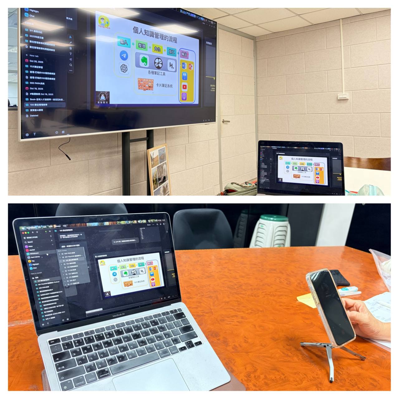 原本預定曹姐上一小時課、她的員工上一小時,但曹姐臨時身體不適,所以整堂課由她的員工參加。今天的主題聚焦在 AI,特別是 ChatGPT 的應用。我帶著自己的無線投影棒,設定好連接,順利開課。學生主要負責旅遊行程規劃,常用 ChatGPT 與 Gemini 搜尋資訊,但尚未建立系統性的數位管理觀念。我先從「輸入、整理、內化、加工、輸出」五步驟的知識管理架構說起,介紹 Telegram、ChatGPT、Heptabase 的搭配使用,並說明 Evernote 與 Heptabase 的差異。接著教他個人化設定 ChatGPT、認識 GPTs、專案與學習模式等功能,也展示了我為旅行社設計的 GPTs 範例。整堂課結構清晰,學生聽得專注。