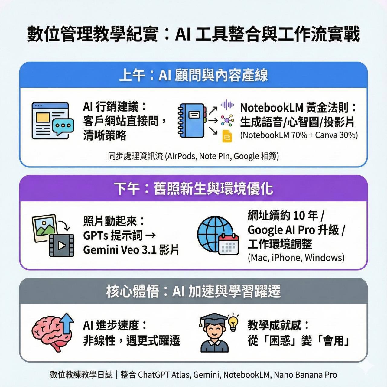 今天的數位管理教學,正式把 ChatGPT Atlas、Gemini、NotebookLM、Nano Banana Pro 全部整合進學生的工作流程。
