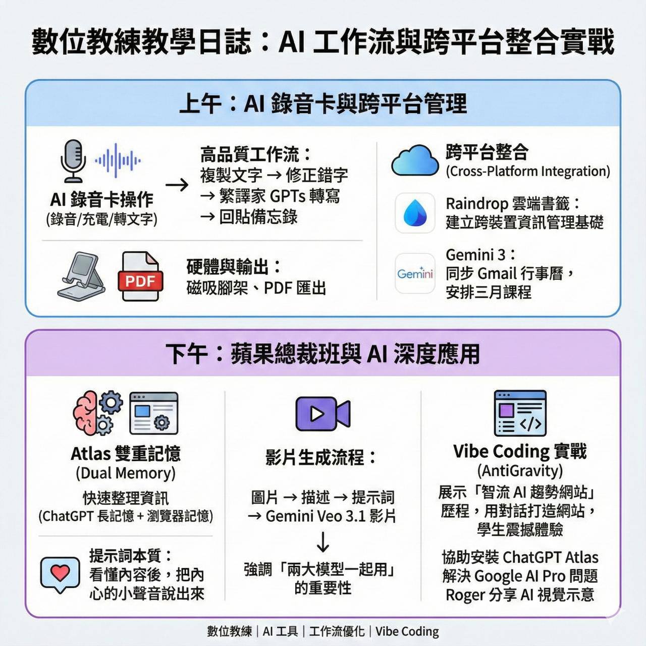 下午的「蘋果總裁班」課程主軸仍是 AI 與工作流。幫陳總安裝 ChatGPT Atlas,也協助邦寧大哥解決 Google AI Pro 問題。Roger 分享越南拍攝幕後與露營地 AI 視覺示意,同學們都非常興奮。