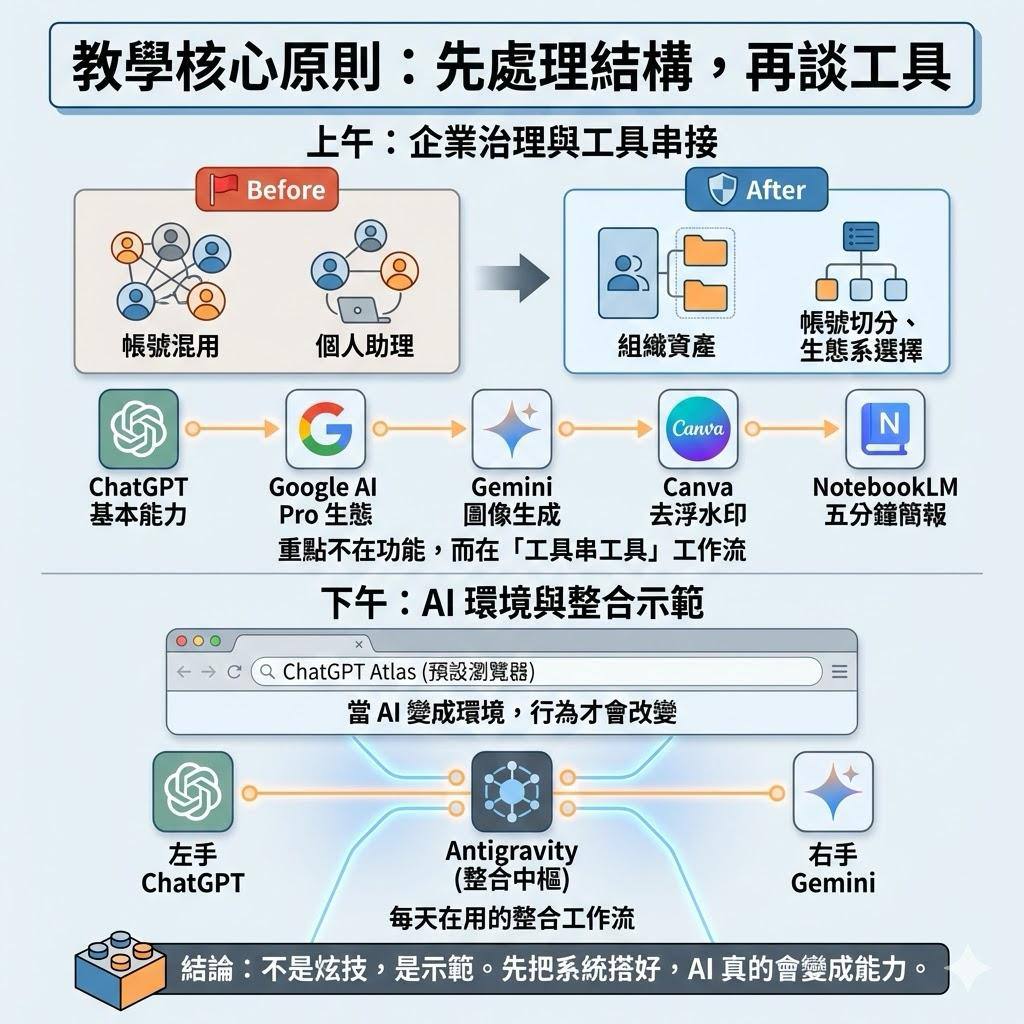 上午和營運長的第一堂課,很快就看見紅旗——公司與個人帳號混用。於是先做治理:帳號切分、生態系選擇,讓 AI 從「個人助理」變成「組織資產」。