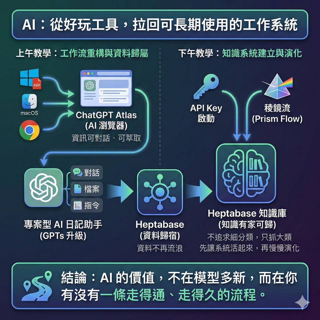 下午,正式啟動 API Key、稜鏡流與 Heptabase,建立「知識有家可歸」的概念。不追求細分類,只抓大類,先讓系統活起來,再慢慢演化。