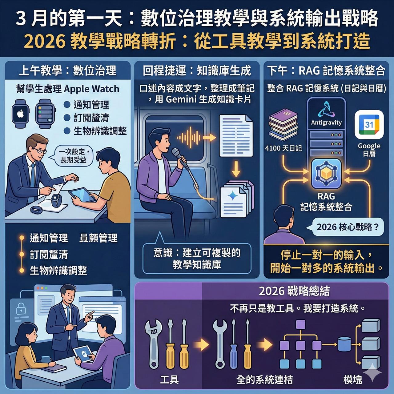 回程捷運上,我把教學內容口述成文字,整理成筆記,再用 Gemini 生成知識卡片。這一刻我意識到:我不只是上課,我在建立可複製的教學知識庫。