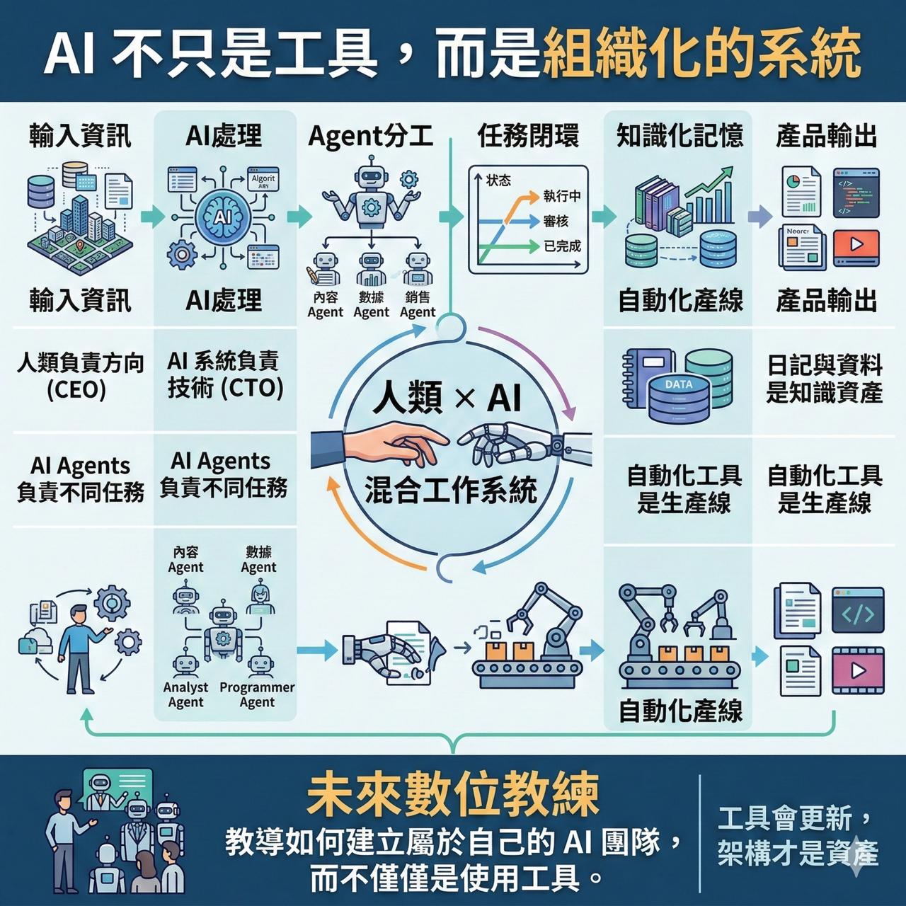 未來數位教練要教的,可能不只是「怎麼用 AI 工具」,而是如何建立一個屬於自己的 AI 團隊。