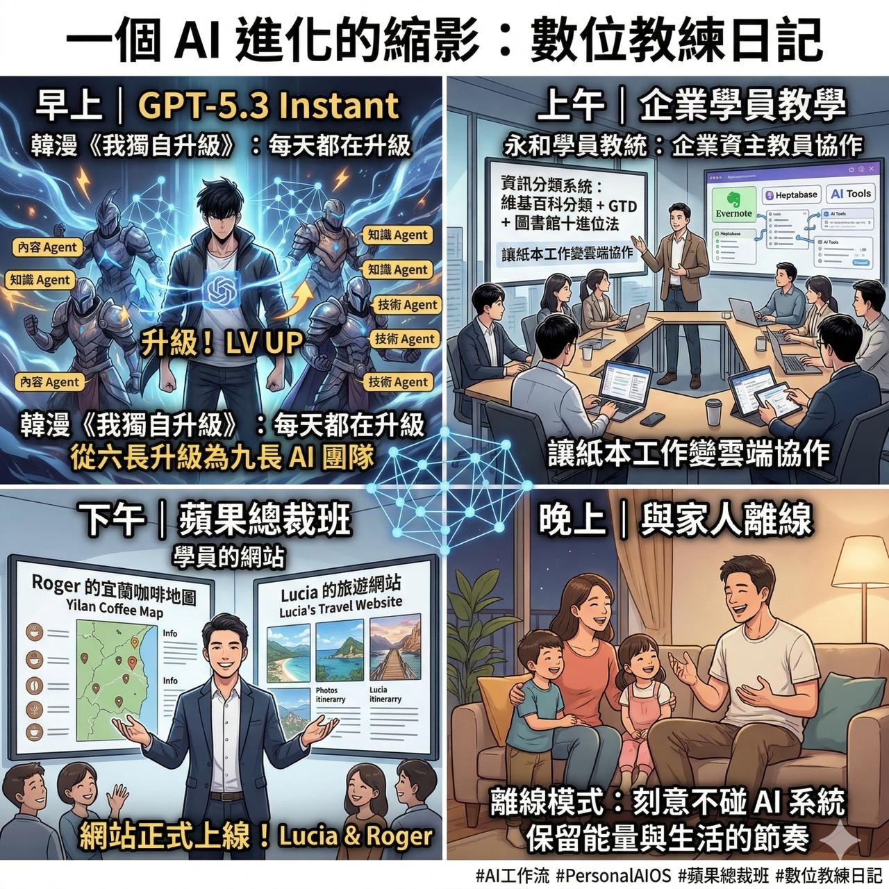 早上發現 ChatGPT 已經升級到GPT-5.3 Instant,回應方式整個變了,還幫我把原本的 AI 團隊重新整理成一套Personal AI OS。原本的「六長」系統重新整合後變成九長 AI 團隊,感覺就像韓漫《我獨自升級》一樣,每天都在升級。