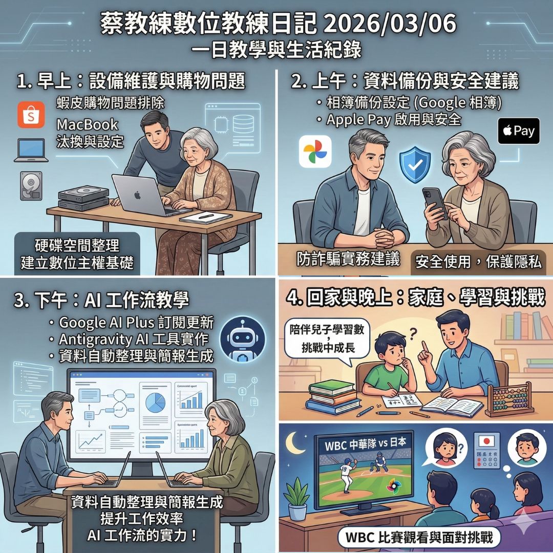今天早上,幫學生處理了蝦皮購物、MacBook 汰換與硬碟空間問題,並協助另一位學生進行照片備份、Apple Pay 設定與防詐騙建議。