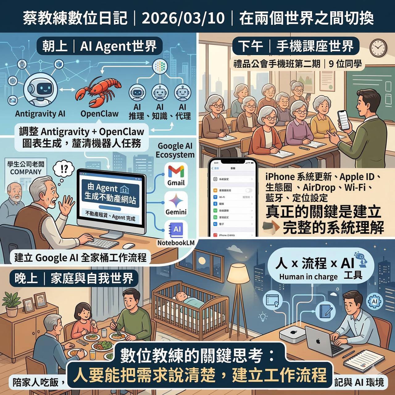 早上先在家裡把Antigravity + OpenClaw(龍蝦 AI)的圖表生成功能調整完成,也重新釐清了三個 AI 機器人的角色與任務。接著到學生公司上課,幫他重新建立Google AI 全家桶(Gmail、Gemini、NotebookLM)的工作流程,並示範用 Antigravity 直接生成一個不動產網站,學生看到 AI Agent 能完成整個任務流程非常震撼。