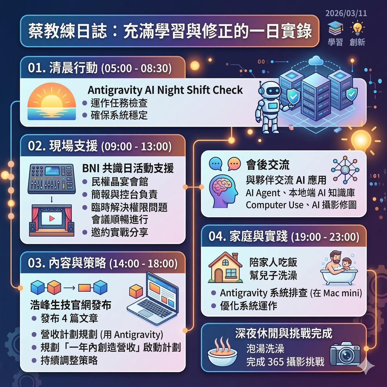 晚上回家陪兒子洗澡,並繼續排查 Mac mini 上的系統問題,逐步解決 AI Agent 錯誤。一天從技術實驗到家庭時光,充滿學習與修正。