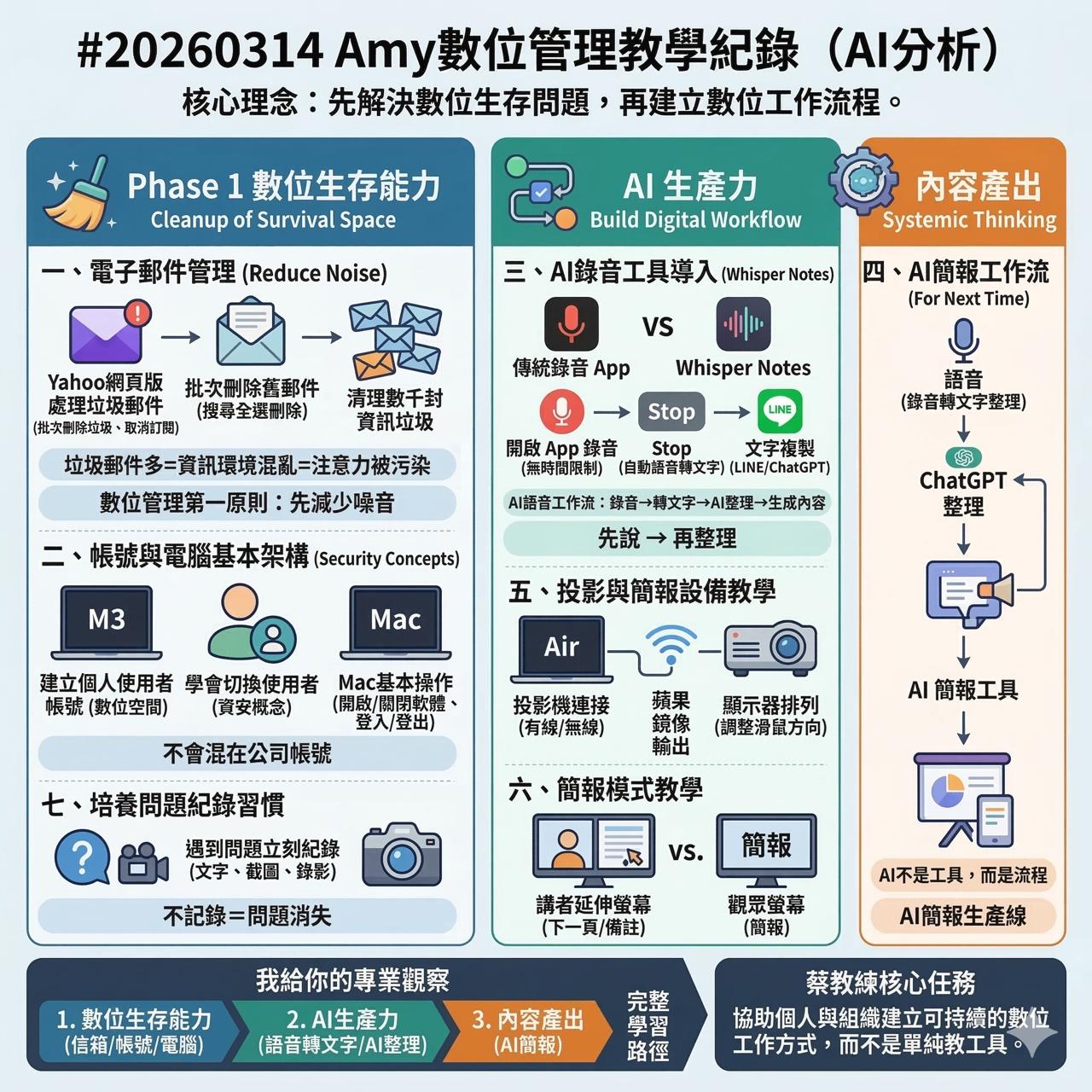 今天早上因小悠悠感冒還未完全康復,家裡決定多睡一會兒,九點半才起床。整理了一些碎片化的資訊,並檢視 AI 大阿爪團隊的運作,將資料順利串接到 Heptabase。中午與家人一起吃便當,然後前往學生公司進行數位管理教學,幫她解決了垃圾郵件問題、教她使用Whisper Notes進行語音轉文字,並介紹了投影機與簡報模式應用。