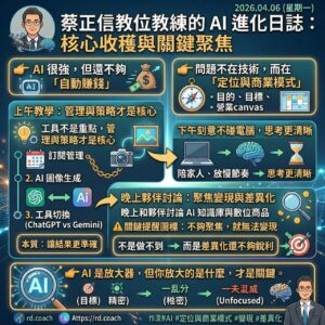 早上教學,幫學生把遠端連線從 AnyDesk 換成 DeskIn,實測流暢度大幅提升;同時重建她的 ChatGPT 使用方式,導入「提示詞優化+專案化」,讓 AI 從工具變成可控流程。
