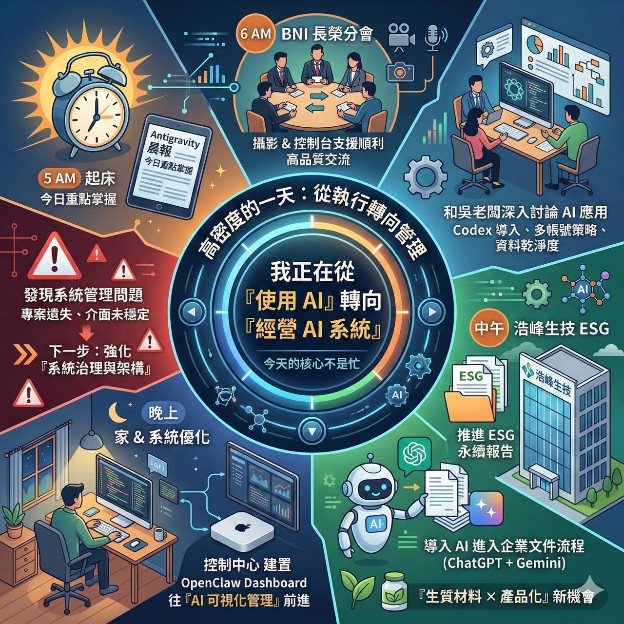 早上 5 點起床,透過 Antigravity 晨報快速掌握今日重點,6 點抵達 BNI 長榮分會,完成攝影與控制台支援,整體流程順利,也和夥伴進行了高品質交流。