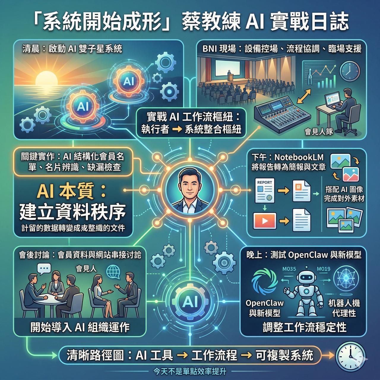 清晨從 AI 雙子星系統啟動一天,到 BNI 現場完成設備控場、流程協調與臨場支援,我逐漸從執行者轉向「系統整合與問題解決的樞紐」。會後更進一步討論會員資料與網站串接,開始把 AI 導入實際組織運作。