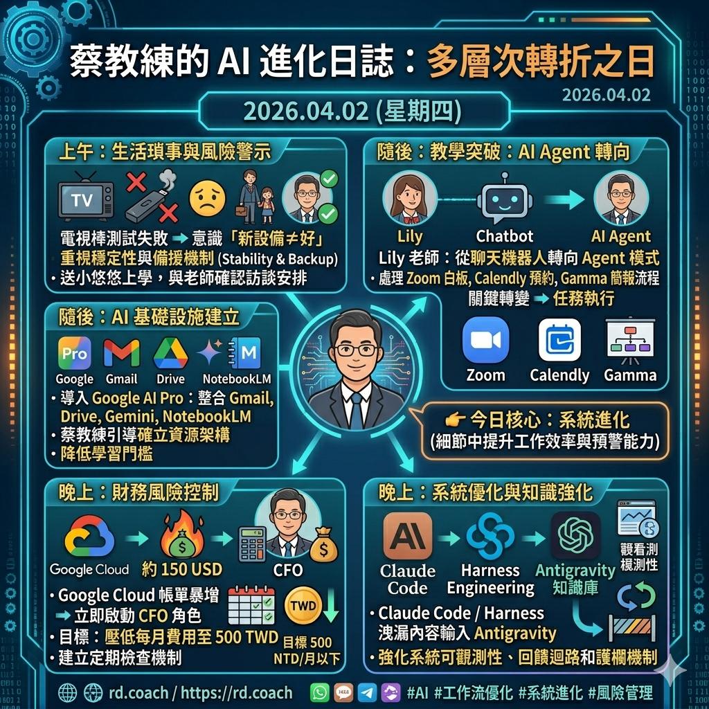晚上回家,我完成日常家務後,將Claude Code 洩漏與 Harness Engineering 的內容輸入 Antigravity,並強化了系統的可觀測性、回饋迴路和護欄機制。途中我也發現 Google Cloud 帳單暴增至約 150 美金,並立即啟動財務長角色,設計目標每月將費用壓低至 500 元台幣以下,並建立定期檢查機制。