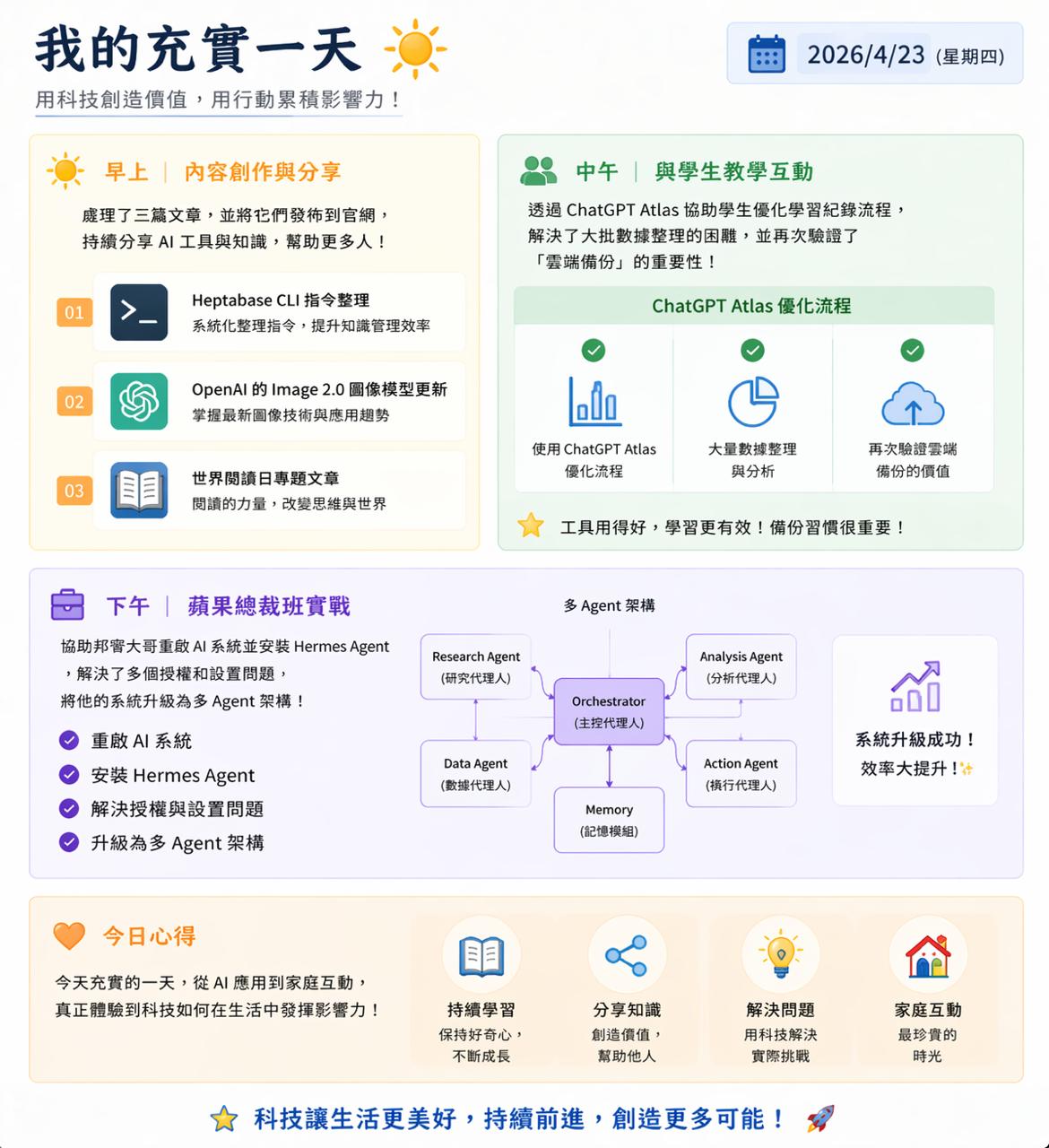 中午與學生教學,透過 ChatGPT Atlas 協助學生優化學習紀錄流程,解決了大批數據整理的困難,並再次驗證了「雲端備份」的重要性。