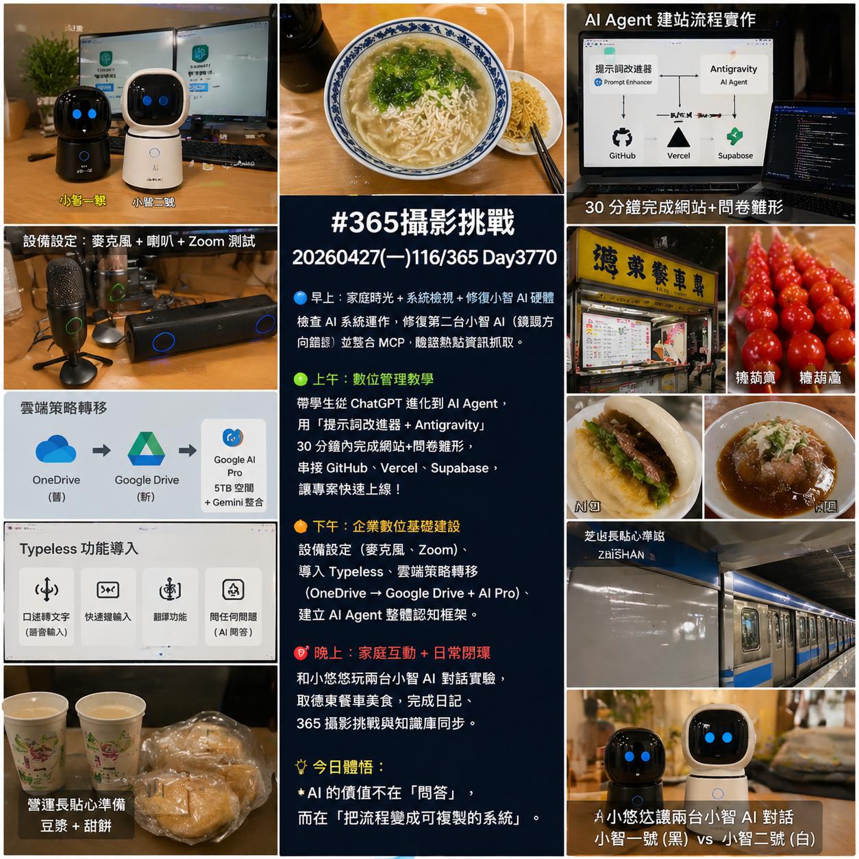 下午則聚焦企業數位地基:設備設定(麥克風、Zoom)、AI 工具導入(Typeless)、雲端策略轉移(OneDrive → Google Drive + AI Pro),以及建立 AI Agent 的整體認知框架。
