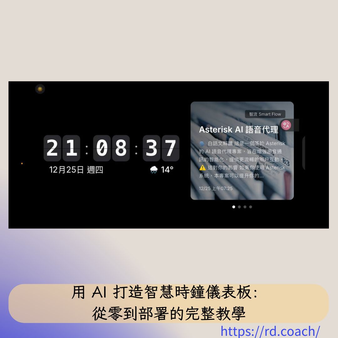 這篇文章記錄了我如何使用 AI 輔助開發工具,在短短幾小時內打造一個功能完整的智慧時鐘儀表板。專案整合了即時新聞、天氣預報、地震資訊和 Google 日曆,並支援響應式設計,可在手機、平板和桌面上完美顯示。
