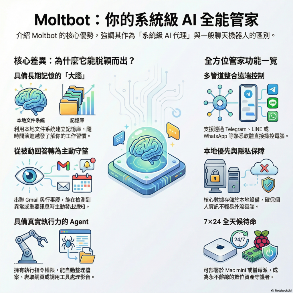市面上的 AI 工具多如過江之鯽,為什麼 Moltbot 能脫穎而出?核心原因有三點: