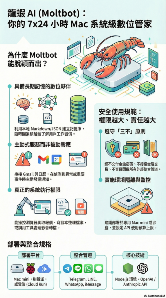 這是被稱為「管家」的關鍵。傳統 AI 是被動的(你問,它答)。Moltbot 可以連接你的 Gmail、Google Calendar、Slack 或 Telegram。當重要郵件進來,或者檢測到伺服器異常,它會主動發訊息通知你。它不只是坐在那裡等指令,它在幫你「守望」你的數位資產。