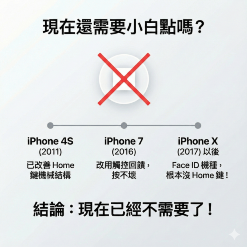 2. 現在還需要小白點嗎? 答案是:不需要了! 2011 年的 iPhone 4S 已經改善了 Home 鍵的機械結構。到了 iPhone 7,Home 鍵改用觸控回饋,根本按不下去,自然也不會按壞。而從 iPhone X 開始的 Face ID 機種,連 Home 鍵都沒有了,根本沒有按壞的風險。小白點現在只會擋住畫面和文字輸入。