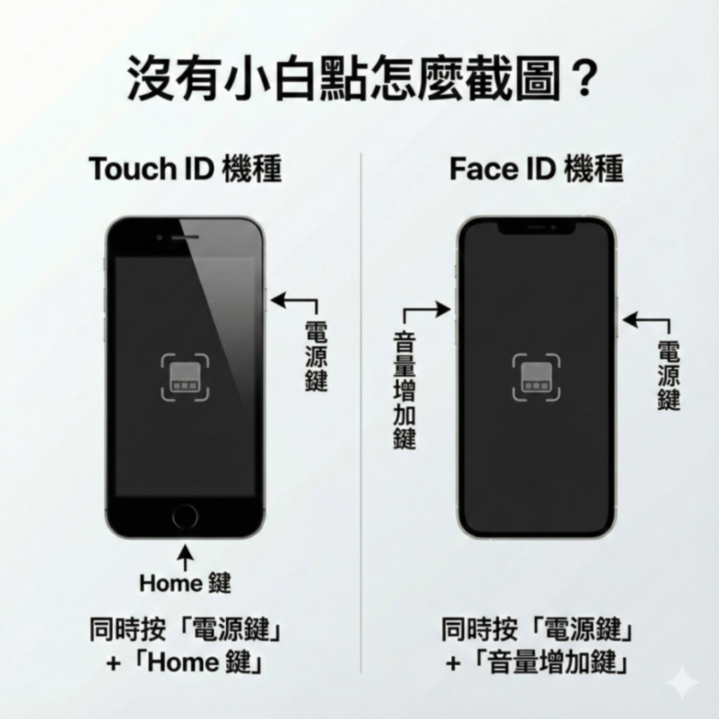 - Face ID 機種: 同時按下 「電源鍵」 + 「音量增加鍵」。 這兩個組合鍵是系統預設的截圖方式,簡單又快速。