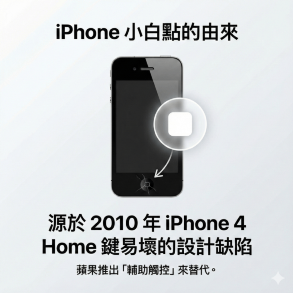 1. iPhone 小白點的由來 「輔助觸控」(俗稱小白點)的出現,要追溯到 2010 年的 iPhone 4。當時的 Home 鍵設計不良,容易因為頻繁使用而損壞,因此蘋果在 iOS 設定中新增了這個功能,作為實體 Home 鍵的替代方案。