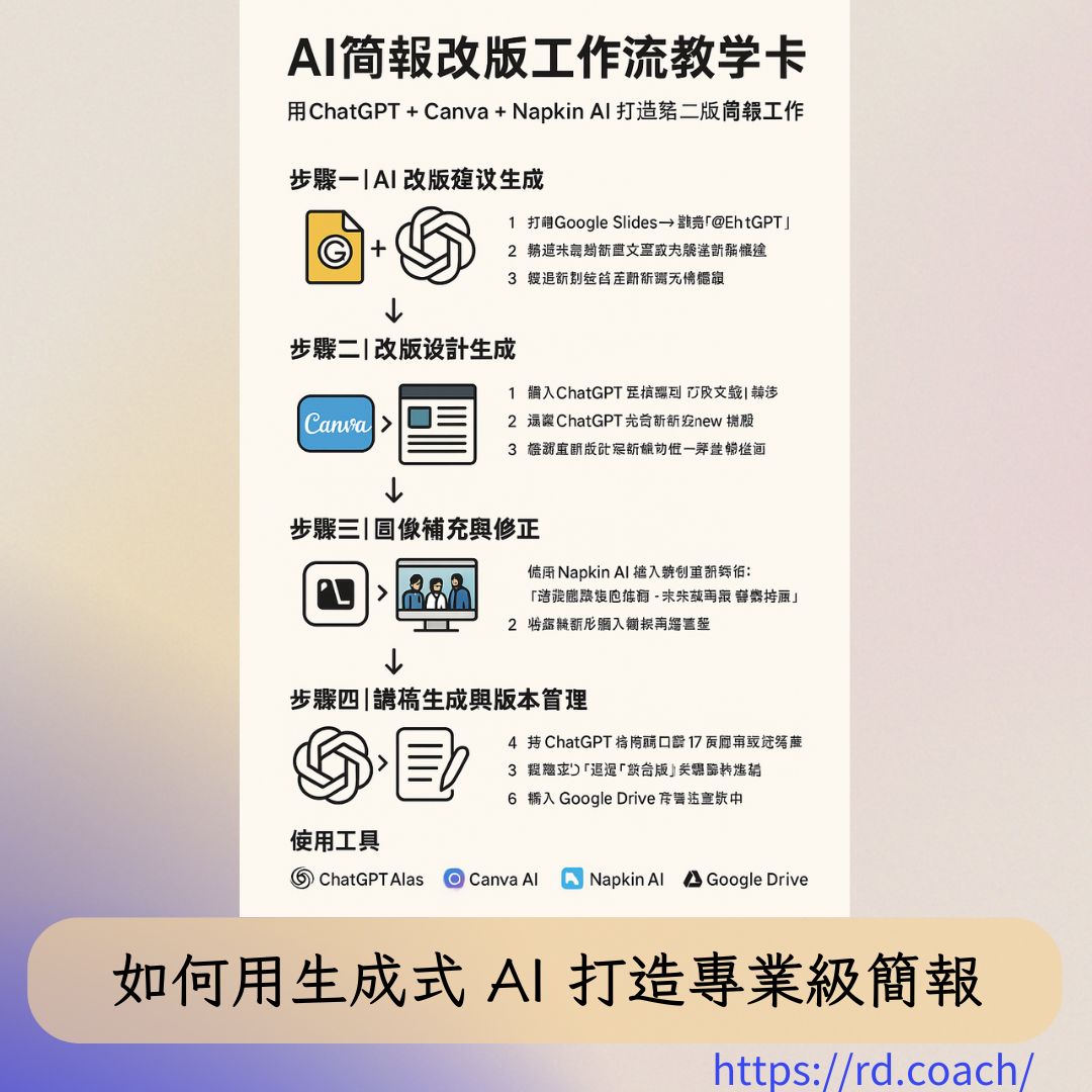 當你熟悉這套流程,任何一份簡報、教材、甚至 Pitch Deck,都能在一天內進入第二版,而品質卻能提升兩個層級。