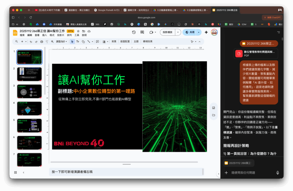 我通常會先在 ChatGPT Atlas https://openai.com/zh-Hant/index/introducing-chatgpt-atlas/ 把原本的簡報放在 Google 簡報 裡,然後直接打開右上角的「詢問 ChatGPT」。