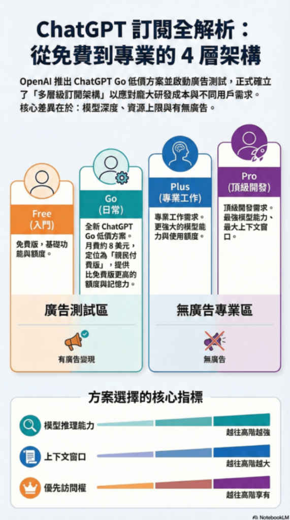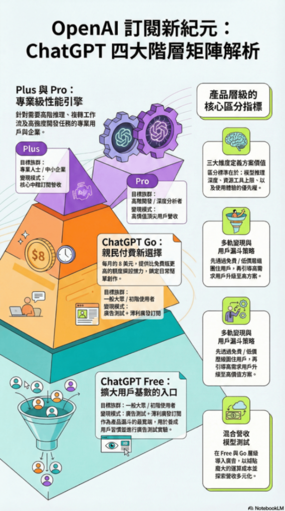 從第一原則拆解,目前 OpenAI 的 ChatGPT 產品線不再是單一工具,而是一個多層級訂閱架構(free → Go → Plus → Pro)。這種分層不是為了湊熱鬧,而是要解決兩個核心痛點:一是面對龐大的基礎建設與研發成本,二是對應不同用戶的真實需求與使用強度。