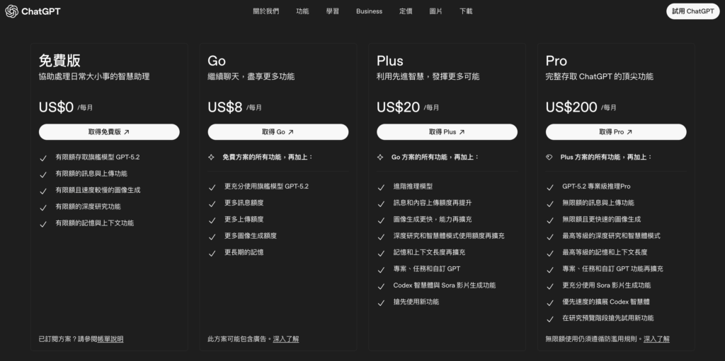 Free → Go → Plus → Pro 表示從基本對話、日常創作到高階推理與工具調用的能力遞進。 - 資源上限與工具支援