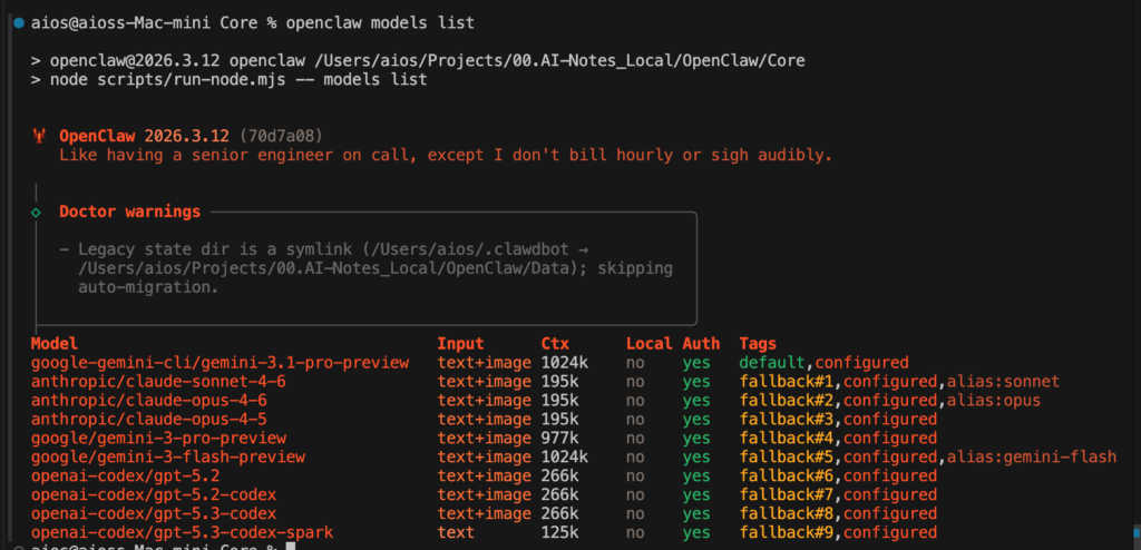 檢查models list : openclaw models list